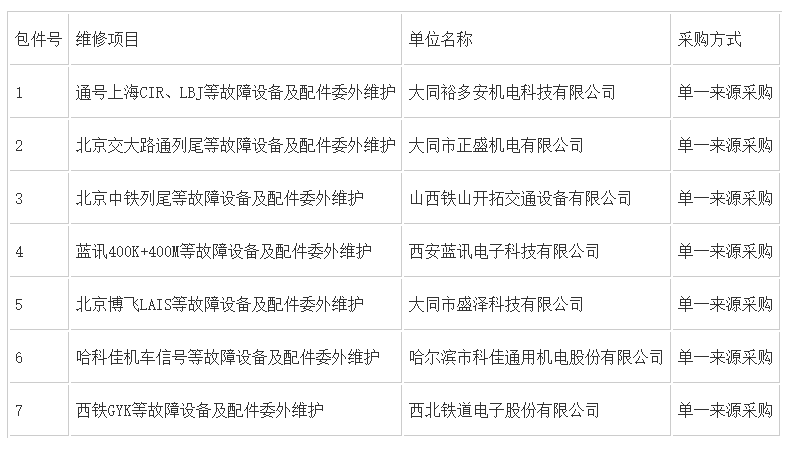 ******有限公司大同電務(wù)段2026年車載系統(tǒng)故障設(shè)備及板件維護項目進行單一來源采購?,F(xiàn)公示如下: