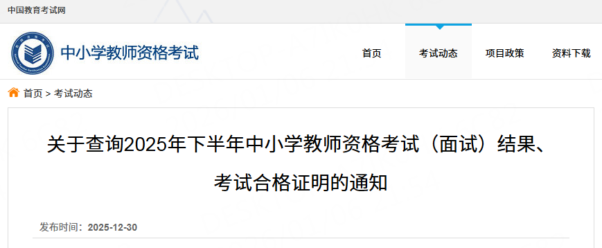 2******小學(xué)教師資格考試(面試)結(jié)果、考試合格證明于2026年1月7日開放查詢,現(xiàn)將有關(guān)事宜通知如下: