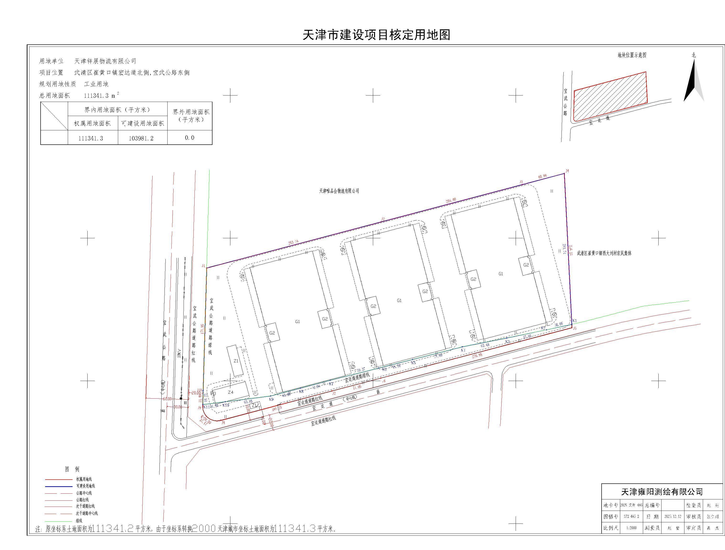 ******有限公司津武(掛)G2014-229號工業(yè)用地項目位于武清區(qū)崔黃口鎮(zhèn),東至崔黃口鎮(zhèn)西大劉村農(nóng)民集體現(xiàn)狀空地(規(guī)劃工業(yè)用地),西至寶武公路,北至崔黃口鎮(zhèn)南縣豪村農(nóng)民集體現(xiàn)狀空地(規(guī)劃倉儲用地),南至宏達道,規(guī)劃條件通知書編號為2026武清規(guī)條申字0013,用地面積:103981.2平方米,原權屬用地面積111341.3平方米,規(guī)劃用地性質(zhì)為工業(yè)用地,容積率1.0 - 2.0,綠地率20%。