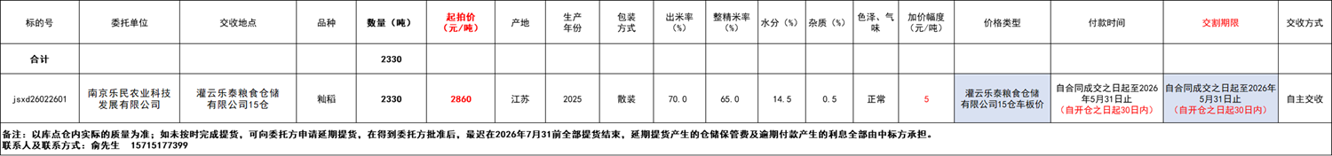 買賣雙方自主完成交割(雙方自行承擔資金安全責任,自行采取有效措施防范交割風險),買受人憑成交合同,憑身份證明帶款或有效匯款憑證到賣方指定庫點提貨,交割完成后買賣雙方憑雙方確認單到交易市場退保證金(保證金不沖抵貨款,待合同履約結(jié)束后統(tǒng)一釋放)。交款期、交割期為合同成交之日起至2026年5月31日,自開倉之日起30日內(nèi)提清。如未按時完成提貨,可向銷售方申請延期提貨,在得到銷售方批準后,最遲在2026年7月31前全部提貨結(jié)束,延期提貨產(chǎn)生的倉儲保管費及逾期付款產(chǎn)生的利息全部由中標方承擔