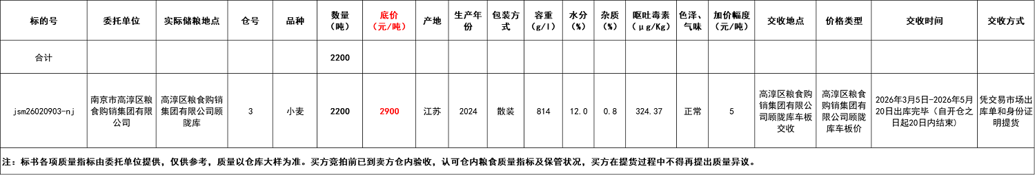 交款、交割期為2026年3月5日-2026年5月20日出庫完畢(自開倉之日起20日內(nèi)結(jié)束)。中標(biāo)方成交后憑市場出庫單和身份證明到賣方指定庫點(diǎn)提貨,交割完成后買賣雙方憑雙方確認(rèn)單到交易市場退保證金(保證金不沖抵貨款,待合同履約結(jié)束后統(tǒng)一釋放)。該批小麥為地方儲(chǔ)備糧,糧食行政主管部門批準(zhǔn)同意輪出后出庫。